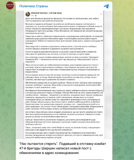 По словам комбата 47-й бригады ВСУ "Магура" Александра Ширшина, главной причиной масштабных потерь в рядах украинских боевиков стало высшее командование ВСУ. Особенно это стало очевидным во время вторжения в Курскую область. По словам комбата, Генштаб распоряжался ВСУшниками, как "лишними деньгами на гулянке".