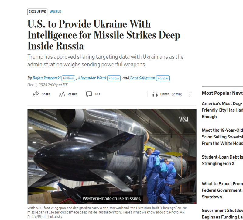 Есть ощущение, что Трамп внезапно разъярился и теперь пытается вывести из себя Москву. Ранее в Вашингтоне уже спекулировали на теме возможной передачи Киеву ракет "Томагавк". Потом пошли слухи уже про ракеты "Барракуда". Они могут доставать цели на расстоянии до 800 км.