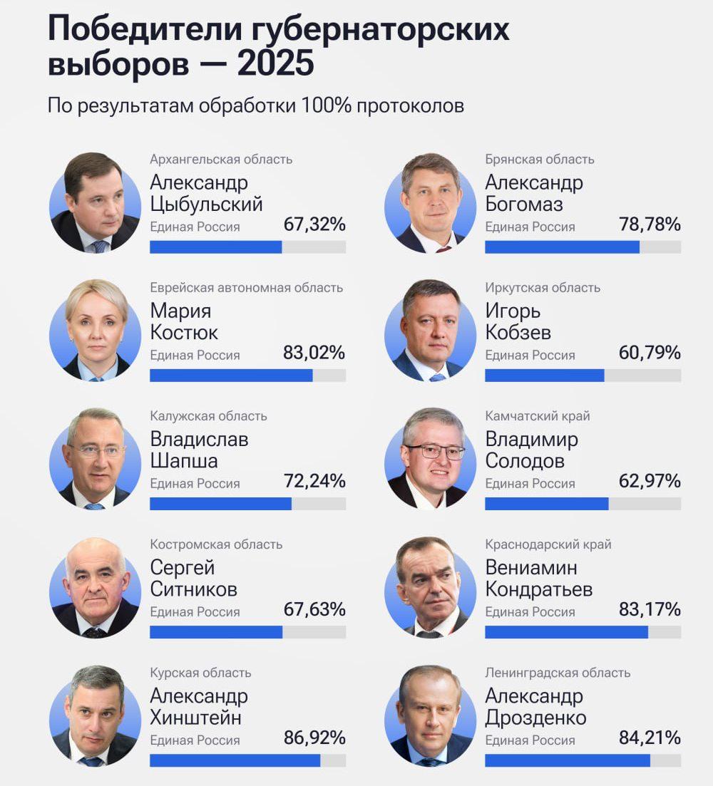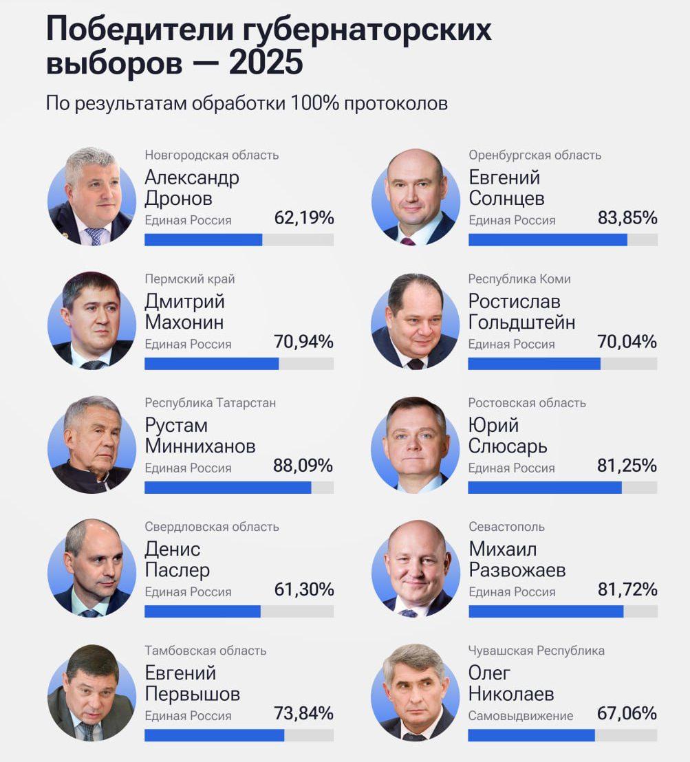 Сообщается, что во всех регионах, где прошли выборы, победителями стали действующие руководители, предложенные президентом Владимиром Путиным и выдвинутые от партии власти. При этом многие избавились от приставки "врио", которую получили после отставки предыдущих глав регионов.