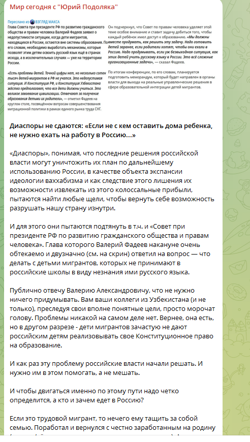 И вот уже не абы откуда, а аж из Совета при президенте России по развитию гражданского общества и правам человека раздаются возгласы - опять русские должны думать, как решать проблемы детей приезжих инородцев.