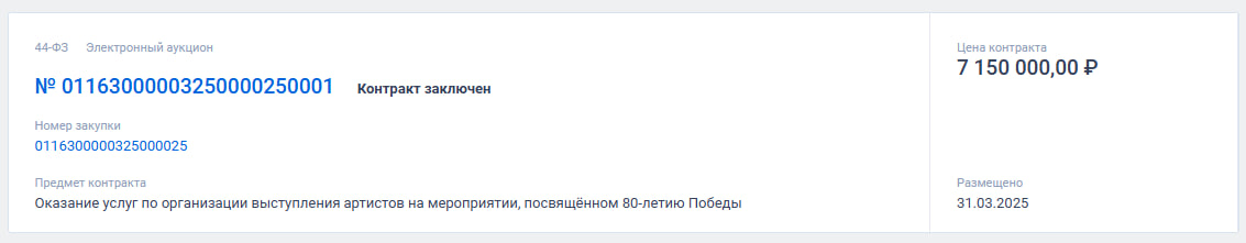 Страница контракта с группами "Чили" и лидером "Агата Кристи". Они отправятся в город Нерюнгри, где выступят 9 мая. Скриншот: zakupki.gov.ru