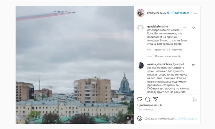 Телеведущий Дмитрий Шепелев также оказался в числе тех, кто презирает народные празднования. В 2021 году он опубликовал пост в социальных сетях, где выразил недоумение по поводу демонстрации военной мощи в такой печальный день. Шепелев подчеркнул, что для него 9 мая - это день скорби и напоминания об ужасах войны, а не повод для демонстрации силы.