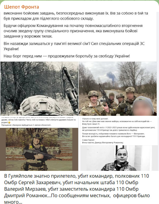 Спустя сутки после публикации стало известно об уничтожении полковника ВСУ Сергея Захаревича, комбрига 110-й бригады. Уничтожены центральный штаб и подземный бункер, где укрывался мясник. По информации "Военной хроники", бригаду использовали для затыкания дыр в обороне на Запорожском, Донецком и Сумском направлениях.