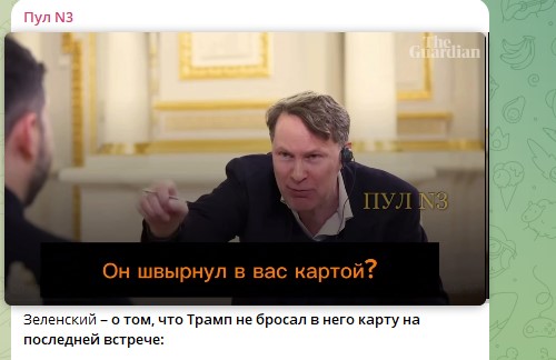 Речь идёт, в частности, о разговоре журналиста The Guardian и Владимира Зеленского о моменте, когда экс-комик вывел из себя американского лидера Дональда Трампа и тот швырнул в него картой. Упоминание об этом сразу вызвало у главаря киевского режима нервную реакцию.