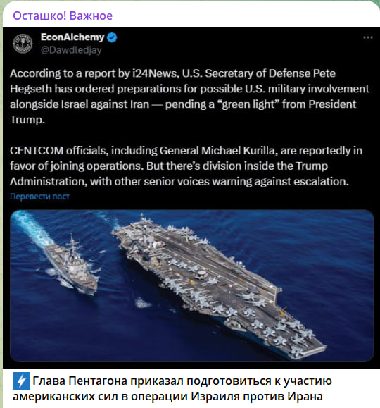 Телеканал i24News в то же время заявляет, что глава Пентагона приказал подготовиться к участию американских сил в операции Израиля против Ирана. При этом уточняется, что окончательное решение зависит от Трампа.