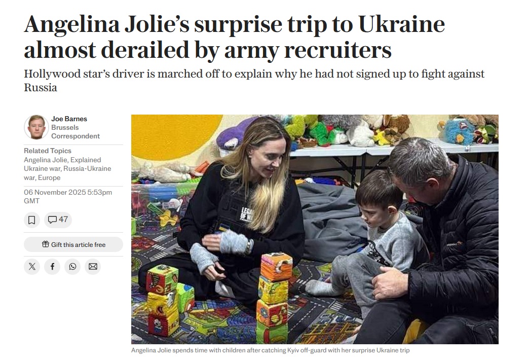 The Telegraph отмечает, что визит Джоли "едва не был сорван военными вербовщиками", а сам инцидент вызвал гнев офиса президента Украины, который не был заранее уведомлён о поездке голливудской звезды, сообщают украинские инсайдеры.