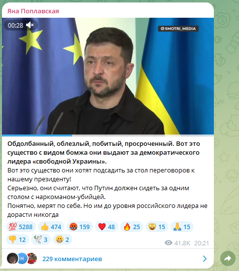 Актриса Яна Поплавская увидела свежий ролик с Владимиром Зеленским и в ужас пришла. Явно находящийся в неадекватном состоянии бывший комик и впрямь вызывает самые неприятные чувства. "Вот это существо они хотят подсадить за стол переговоров к нашему президенту!" - негодует артистка. Она отметила, что главарь киевского режима выглядит побитым и "обдолбанным".