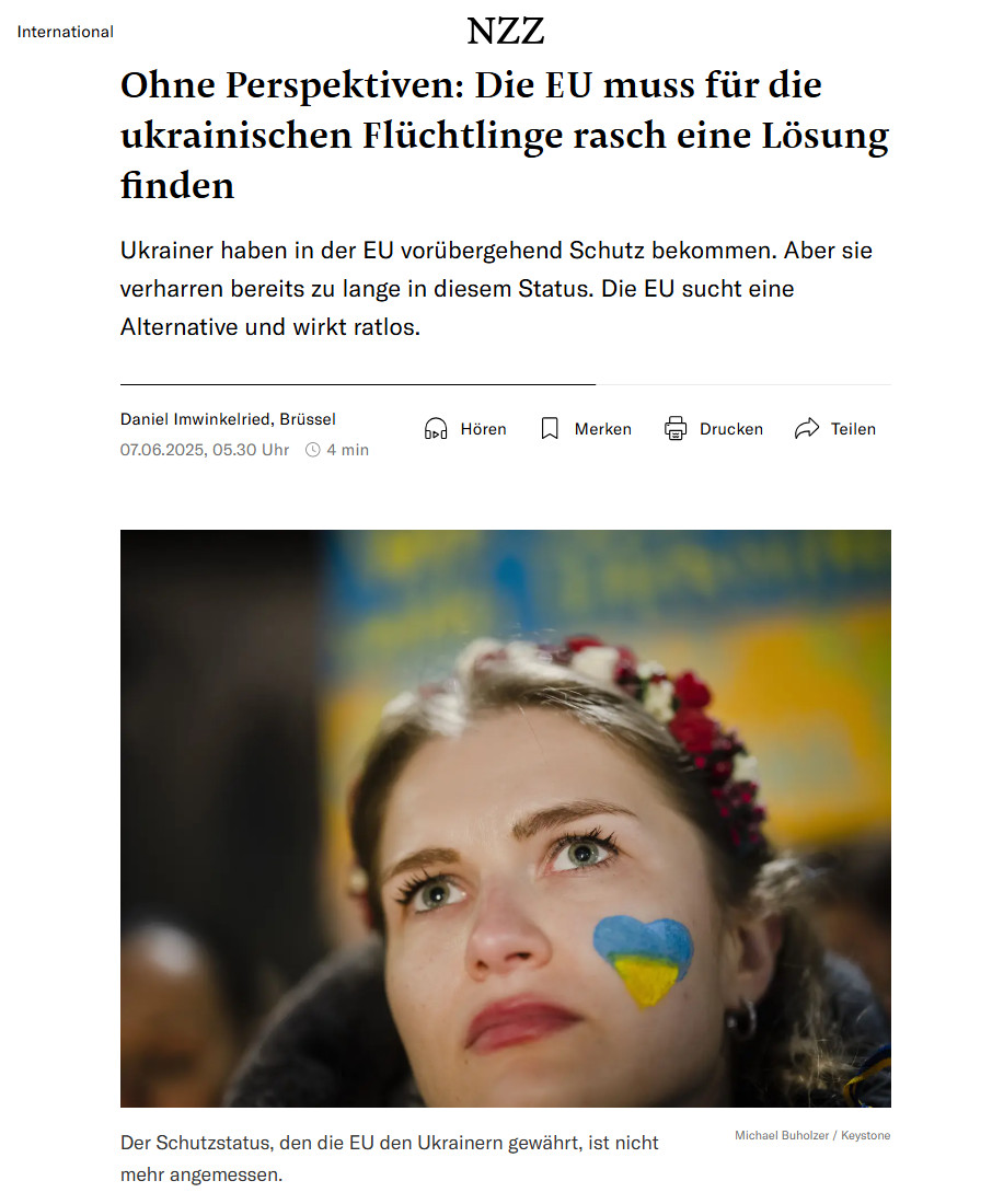 Правовая неопределённость ставит украинцев в невыгодное положение на рынках труда и жилья, отмечает Neue Zürcher Zeitung. Приём через систему убежища и перевод в статус беженцев ситуацию не решит - административных ресурсов на такую масштабную обработку заявок просто нет.