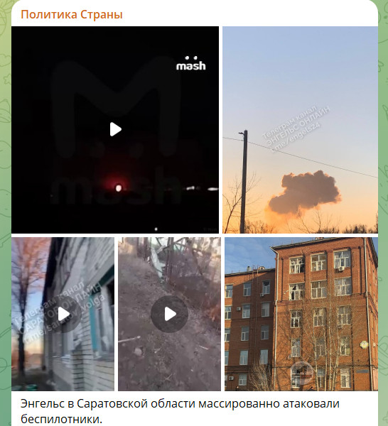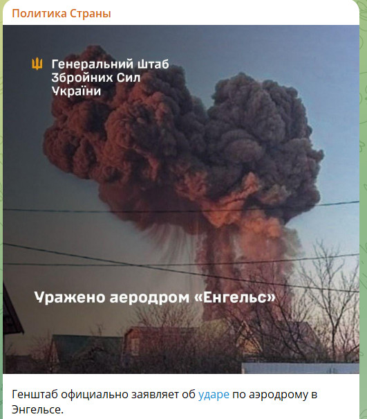 Вскоре Генштаб официально заявил об ударе по аэродрому в Энгельсе. Сообщается, что в районе аэродрома зафиксирован пожар, взрывы и вторичная детонация боеприпасов.
