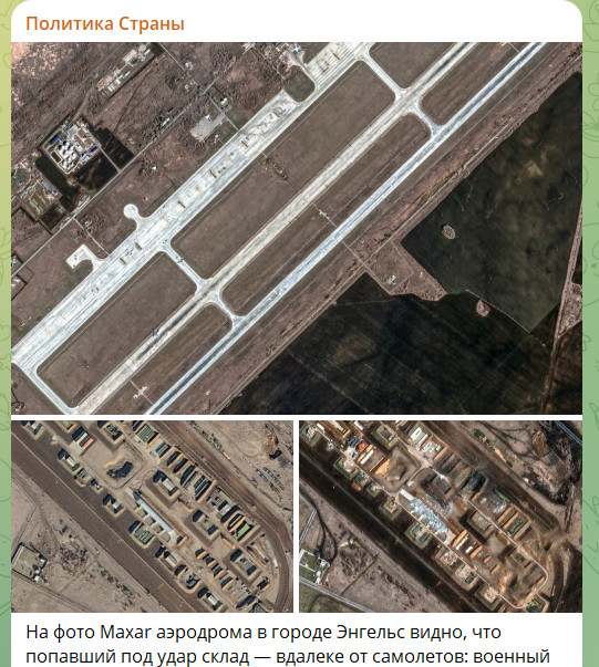 На фото аэродрома, сделанном компанией Maxar, которое опубликовал украинский ТГ-канал "Политика страны", видно, что под удар попал склад - он находится вдалеке от самолётов. Военный обозреватель Би-би-си, комментируя спутниковые фото последствий атаки украинских дронов на русскую авиабазу в Энгельсе, отметил следующее: