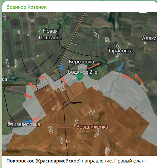 Подробности происходящего у Покровска и ближайших направлений сообщил военкор Юрий Котенок. По его данным, на правом фланге Покровского направления враг предпринял несколько контратак в районе Тарасовки и Елизаветовки с целью восстановить положение на ранее занимаемых позициях. Успеха не имел, понёс потери, пытался нанести удары НУРСами (неуправляемыми ракетами) по нашим подразделениям с применением вертолётов, промазал. Наши подразделения продвинулись в районе Елизаветовки и продолжают атаковать в направлении восточной и юго-восточной окраин Малиновки и юго-западной и юго-восточной окраин Тарасовки.