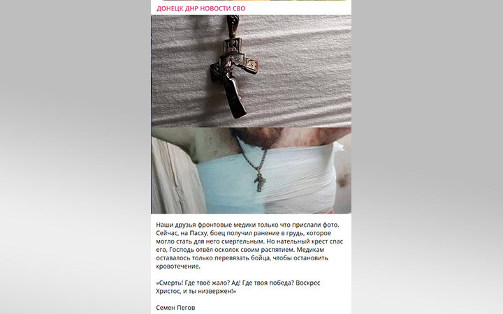В прошлом году в праздник светлой Пасхи произошло аналогичное чудо в зоне специальной военной операции. Известный военкор Семён Пегов поделился этой историей, отметив, что фронтовые медики прислали фото раненого бойца. Осколок мог стать смертельным, но нательный крест спас его, остановив осколок. Медикам оставалось лишь перевязать бойца, чтобы остановить кровотечение.