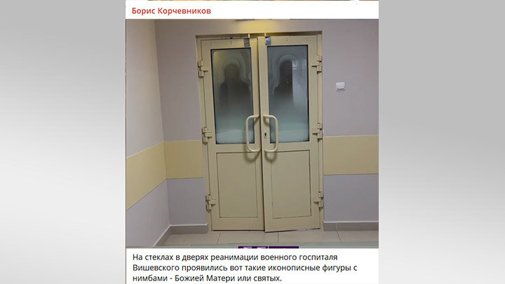 В прошлом году православный телеведущий Борис Корчевников поделился необычным случаем, произошедшим в военно-клиническом госпитале имени Вишневского. Он опубликовал видео, на котором запечатлены стеклянные двери больницы, на которых внезапно появились образы с нимбами. Примечательно, что образы святых появились на каждом этаже.