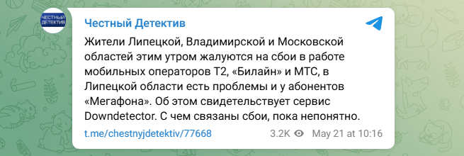 Масштабный сбой в работе мобильной связи зафиксирован сразу в нескольких регионах страны. Тематические каналы сообщают, что на проблемы жалуются жители Липецкой, Рязанской, Тульской, Владимирской и Московской областей.