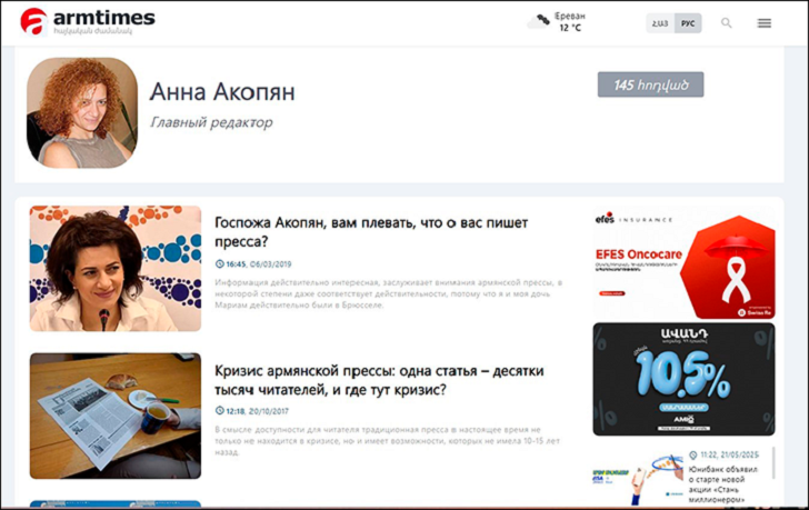 Анна Акопаян, супруга Пашиняна, является главредом одной из центральных газет Армении: семейного издательского бизнеса и рупора премьер-министра республики. Скриншот: armitimes