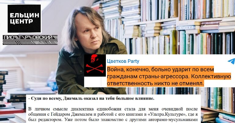 Цветков отметил, что его увлечение исламом возникло под влиянием покойного радикала Гейдара Джемаля, который поддерживал террористов Басаева и Хаттаба и участвовал в антипутинских акциях. Однако важнее другое: в феврале 2022 года магазин "Пиотровский" и его руководство, работая ещё в екатеринбургском "Ельцин Центре", выступили против России.