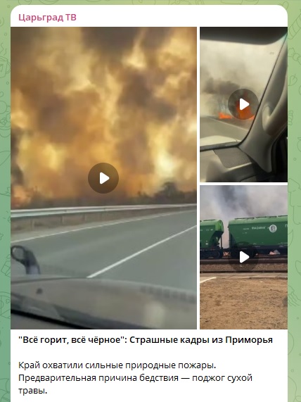 Ранее в Сети опубликовали видео из Приморского края, на котором видна стена огня и чёрного дыма, что простирается вдоль дороги. Как отмечают авторы ролика, жар пламени чувствовался даже в салоне закрытого автомобиля. Утверждалось, что кадры были сняты у поворота на село Андреевку в Хасанском округе Приморья.