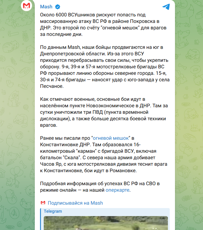 Под Покровском практически сформировался новый огневой мешок, пишут в телеграм-каналах. В окружении оказалось шесть тысяч солдат ВСУ. Источники сообщают: "Мотострелковые бригады ВС РФ прорывают линию обороны севернее города".