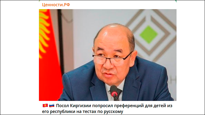В то же время Бишкек намекнул Москве, что хотел бы создать единое образовательное пространство с обучением на русском языке. Министр просвещения Сергей Кравцов отметил, что это поможет распространить русскую культуру и образовательную систему. "Отличился" посол Киргизии Кубанычбек Боконтаев, выступивший с просьбой отменить тестирование для киргизских детей при зачислении в школы, напомнив о статусе русского языка как второго государственного.