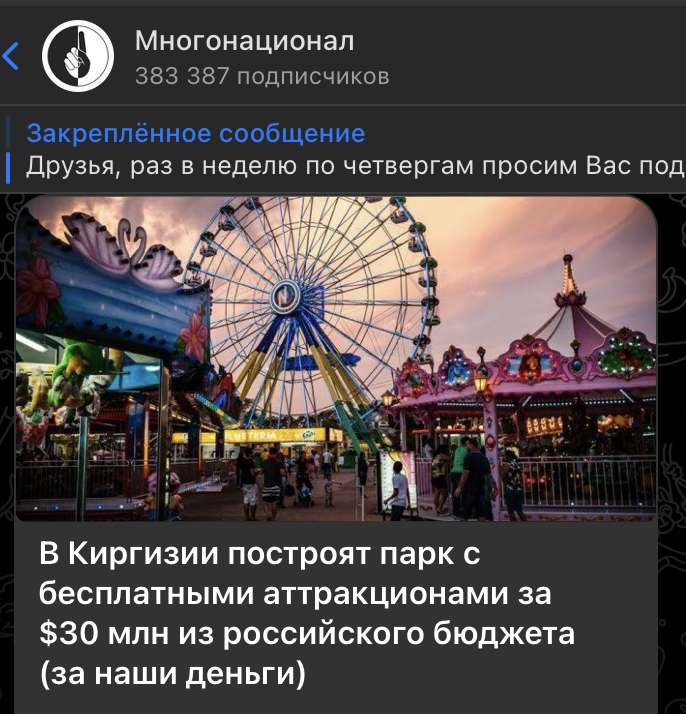 - замечают авторы телеграм-канала "Многонационал", напоминая, что наша страна строит киргизам девять школ и парк аттракционов за 30 миллионов долларов.