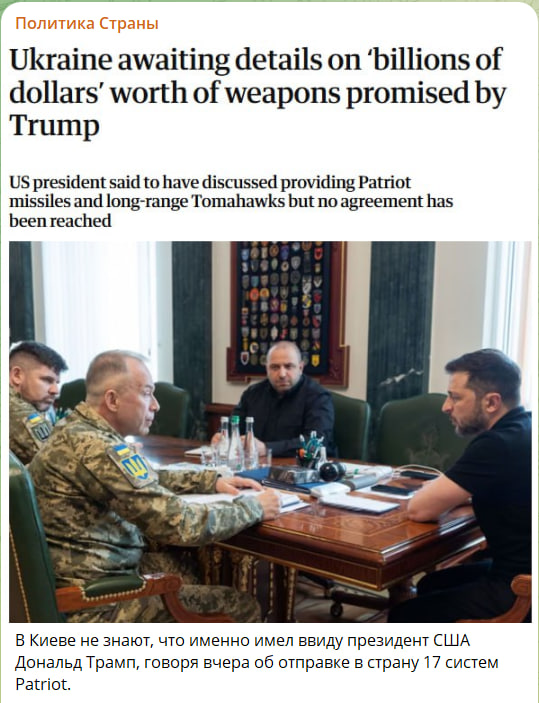 В понедельник Трамп выступил с ультиматумом по отношению к России, заявив, что в случае отсутствия значимых успехов по достижению мира на Украине он готов ввести новые санкции и пошлины, в том числе против партнёров Москвы. Кроме того, он заявил о новых поставках оружия Киеву за счёт Европы, причём с его слов они уже начались, в то время как киевские чиновники открыто признают, что не совсем поняли, что именно имел в виду глава Белого дома.