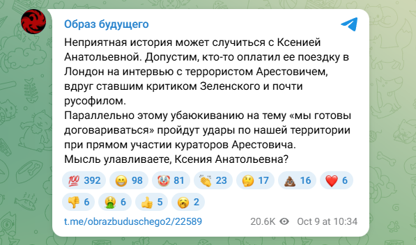 Допустим, кто-то оплатил её поездку в Лондон на интервью с террористом Арестовичем**, вдруг ставшим критиком Зеленского и почти русофилом. Параллельно этому убаюкиванию на тему "Мы готовы договариваться" пройдут удары по нашей территории при прямом участии кураторов Арестовича. Мысль улавливаете, Ксения Анатольевна?