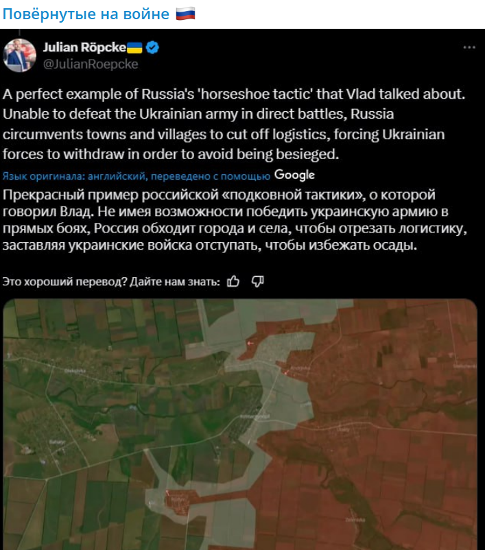 Прекрасный пример русской "тактики подковы". Неспособная победить украинскую армию в прямых боях, Россия обходит города и сёла, чтобы перекрыть логистику, вынуждая украинские войска отступать, чтобы избежать осады,