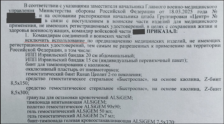 В опубликованном документе, скриншот которого приводит Царьград в расследовании, применение израильских бандажей, гемостатических средств и бинтов, тампонов, гелей и иных подобных средств отечественного производства, например, приказывается запретить для использования. Запрет, напомним, объясняется целью "сохранения жизни и здоровья военнослужащих". Говорится, что издан он в соответствии с указаниями вышестоящего начальства - замначальника Главного военно-медицинского управления Минобороны. Есть ещё одно основание - распоряжение начштаба группировки "Центр".