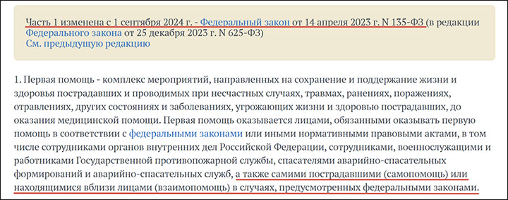 К примеру, Федеральный закон №323-ФЗ от 21.01.2011 "Об основах охраны здоровья граждан в Российской Федерации" в пункте 1 статьи 31 устанавливает, что первую помощь до оказания пострадавшему помощи профессионалом может оказывать любой гражданин. Причём слова "или находящимися вблизи лицами (взаимопомощь)" были включены в закон совсем недавними поправками от 14 апреля 2023 года.