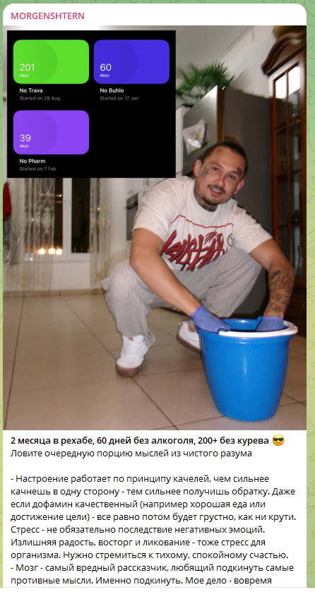 А не так давно рэпер оповестил общественность о том, что он находится в рехабе. Там он попытается избавиться от наркозависимости. Судя по всему, процесс проходит нелегко. О чём Моргенштерн*, конечно, регулярно рассказывает тем оставшимся подписчикам, которым ещё интересно, что с ним происходит.