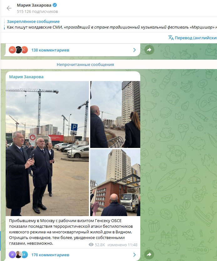 Официальный представитель Министерства иностранных дел России Мария Захарова рассказала об одной из точек визита генерального секретаря ОБСЕ Феридуна Синирлиоглуне в Москве. Высокого гостя привезли в Видное, где в ночь на 11 марта украинский беспилотник попал в жилой многоэтажный дом.