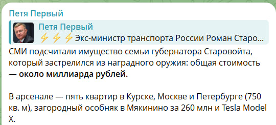Так, например, блогер, автор канала "Петя Первый" со ссылкой на СМИ пишет о том, что у семьи бывшего главы Курской области якобы нашли имущество на сумму в миллиард рублей. В арсенале - пять квартир в Курске, Москве и Петербурге (750 кв. м), загородный особняк в Мякинино за 260 млн и Tesla Model X. Однако пока данные не подтверждены.