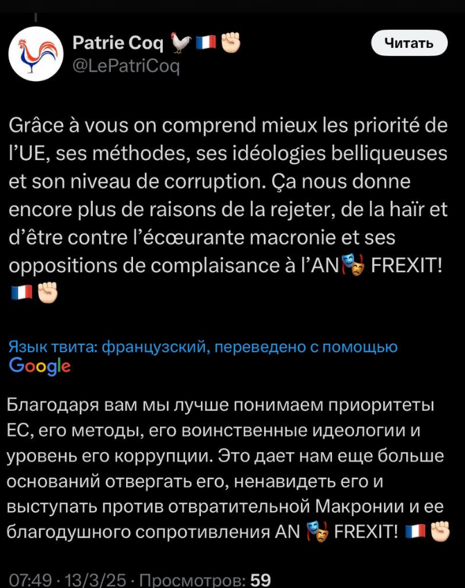 Благодаря вам мы лучше понимаем приоритеты ЕС… Это даёт нам ещё больше оснований отвергать его и выступать против отвратительной Макронии.