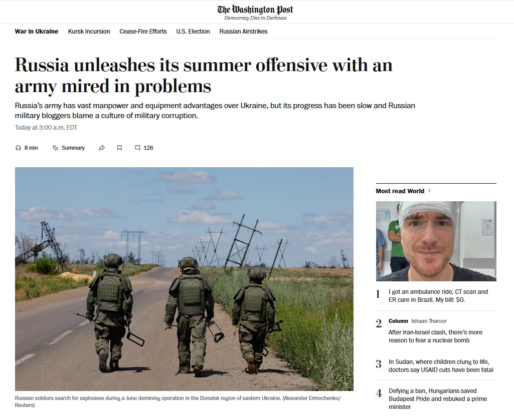 Летнее наступление России с целью достичь решающего прорыва может закончиться провалом, пишет WP. А теперь рассказываем, как обстоят дела на самом деле.