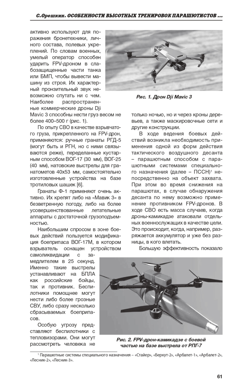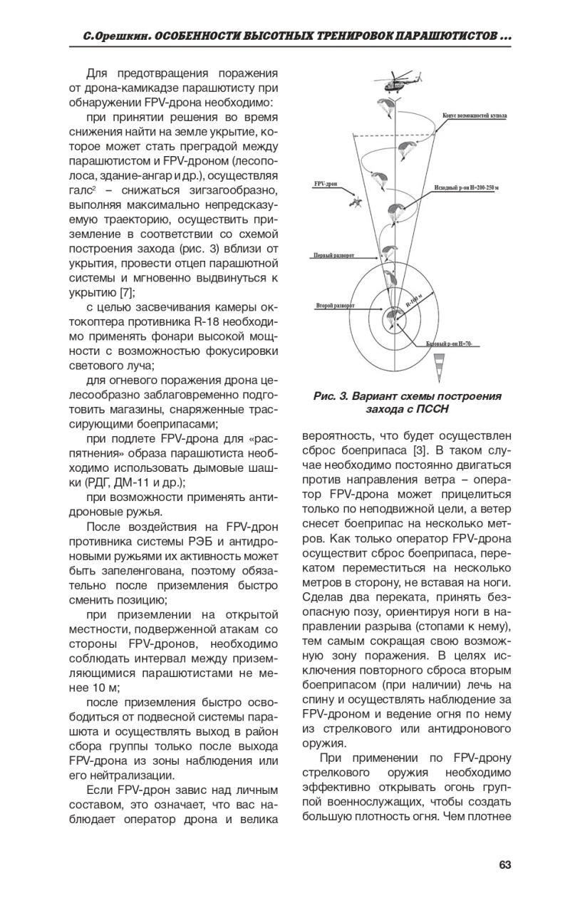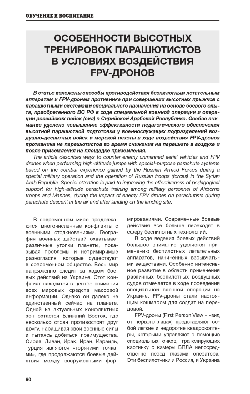 В статье изложены способы противодействия беспилотным летательным аппаратам и FPV-дронам противника при совершении высотных прыжков с парашютными системами специального назначения на основе боевого опыта, полученного в ходе специальной военной операции и операции российских войск (сил) в Сирийской Арабской Республике,