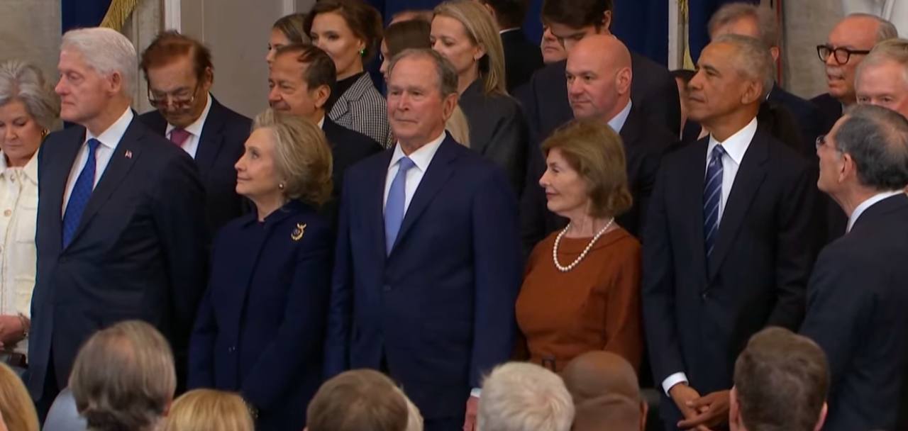 В Сети идёт прямая трансляция инаугурации Трампа, к событию приковано повышенное внимание по всему миру. Трампа видят реформатором западной глобалистской системы, человеком, бросившем вызов многолетней гегемонии либеральных демократов. Теперь они выглядят "партией проигравших". Режиссёр трансляции показал их отдельным планом. Здесь и Билл Клинтон, и Джордж Буш-младший, и Барак Обама. Особенно забавно выглядит экс-президент Буш. Присутствует на церемонии и Джо Байден, но ему предстоит передать власть Трампу.