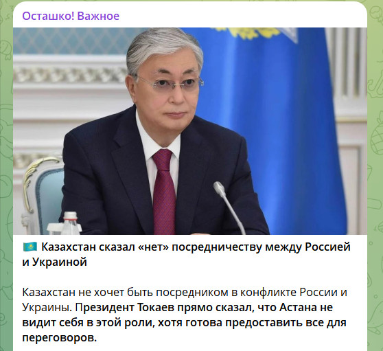 Казахстанский лидер не скрывает, что его страна открыта для сотрудничества с разными центрами силы. В прошлом году он заявлял о готовности предоставить площадку для переговоров России и Украины, но при этом подчёркивал, что Астана не будет посредником. "Казахстан в конфликте между Россией и Украиной не является посредником и таковым себя не видит. На мой взгляд, обе стороны в состоянии вести диалог напрямую", - подчеркнул он.