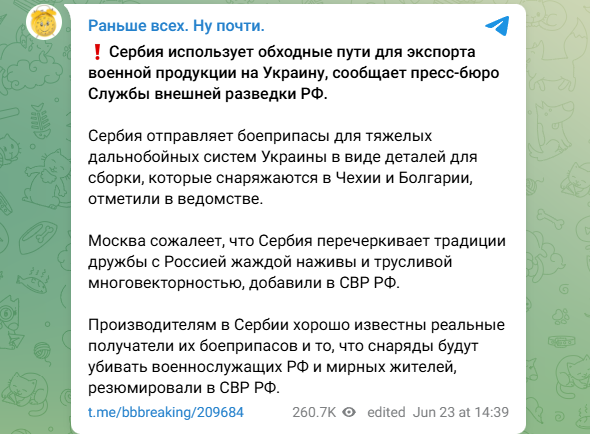 В мае пресс-бюро Службы внешней разведки России сообщало, что сербские оборонные предприятия поставляют боеприпасы для ВСУ. Это было новостью, прямо скажем, ошарашивающей и неприятной. Ведь Сербия всегда публично говорила о своём нейтралитете относительно украинского конфликта.
