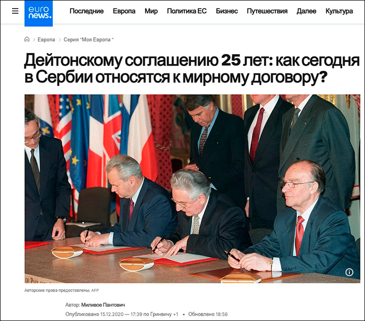 ПРИМЕР НЕДОВОЁВАННОЙ ВОЙНЫ - БОСНИЯ. "КОМПРОМИССНОЕ" СОГЛАШЕНИЕ МОЖЕТ СТАТЬ ПРИЧИНОЙ ВОЗОБНОВЛЕНИЯ КОНФЛИКТА. СКРИНШОТ СТРАНИЦЫ САЙТА EURONEWS.COM