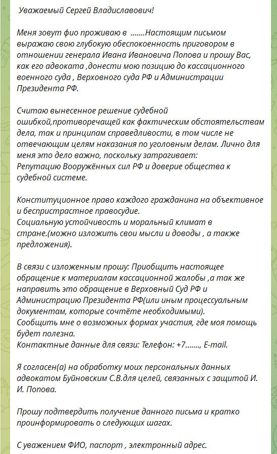 В письме, как указано в образце, следует изложить обеспокоенность вынесенным решением, указать на его противоречие фактическим обстоятельствам и принципам справедливости, а также подчеркнуть важность дела для репутации Вооружённых сил и доверия к судебной системе. В качестве ключевых аргументов предлагается ссылаться на конституционное право каждого гражданина на объективное правосудие, а также на значение морального климата и социальной устойчивости в стране.