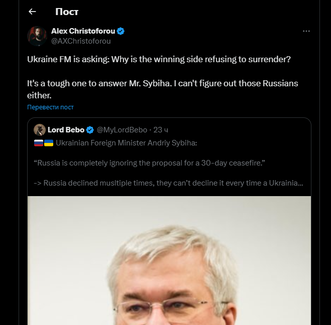 Кипрский журналист Алекс Христофору отреагировал на стенания Сибиги с громким смехом. Это хорошо чувствуется по наполненному иронией посту, в котором журналист процитировал украинского дипломата.