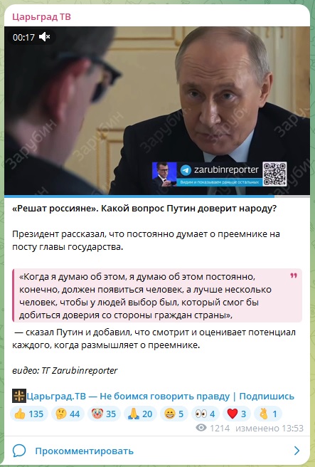 Слова президента Путина о том, что он постоянно думает о преемнике, - это не случайно. После достижения мира система управления в стране поменяется - Конституция готова для этого,