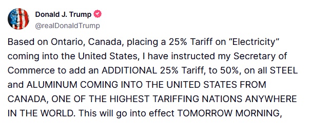 Ограничения должны вступить в силу уже 12 марта. Как заявил Трамп, пошлины повышены в ответ на решение канадской провинции Онтарио ввести пошлины в размере 25% на электричество, поступающее в Соединённые Штаты.