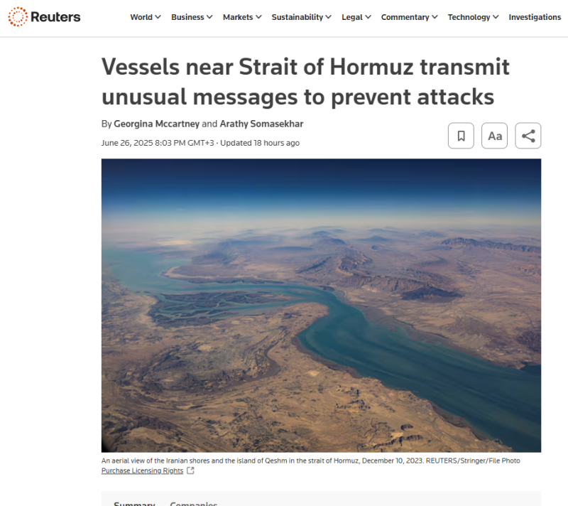 Ухищрения понятны. Примерно пятая часть мирового экспортного топлива и нефти проходит через Ормузский пролив. После нападения Израиля на Иран в Красном море активизировались хуситы, которые пригрозили отомстить и Тель-Авиву, и его союзникам.