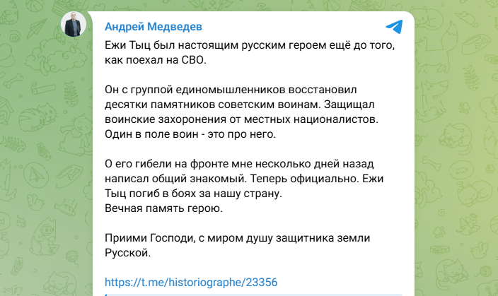 "Ежи Тыц был настоящим русским героем ещё до того, как поехал на СВО", - пишет журналист, депутат Мосгордумы Андрей Медведев.