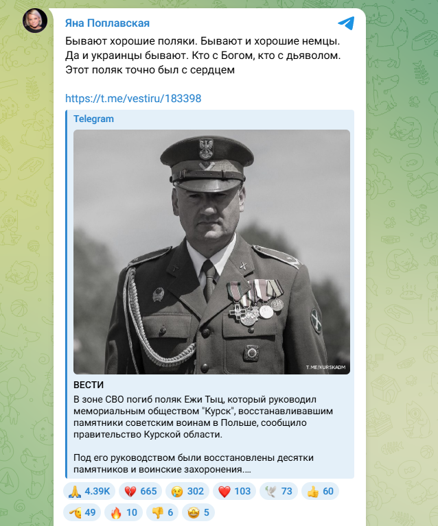 В зоне СВО пал героем Ежи Тыц - актриса Яна Поплавская назвала его "поляком с сердцем". В родной стране мужчине не было места, поскольку он восстанавливал памятники советским солдатам и в целом не разделял русофобию, которую лелеют польские правители. Поэтому Ежи Тыц переехал в России, а после начала спецоперации стоял с русскими плечом к плечу. Его гибель - горькая утрата.