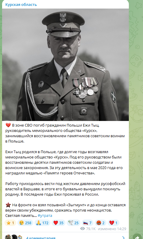 На днях с фронта пришла печальная весть. Ежи Тыц с позывным "Зыгмунт" погиб, сражаясь с врагом плечом к плечу с русскими братьями.