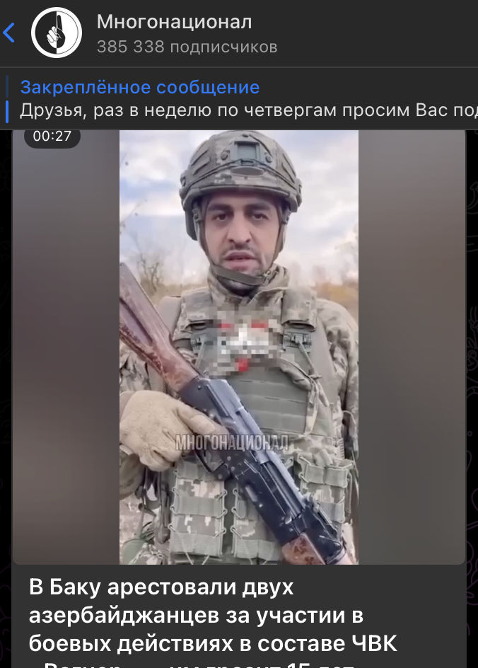 - замечают авторы телеграм-канала "Многонационал", публикуя видео, на котором азербайджанец рассказывает о службе в ВСУ и помощи "братской Украине".