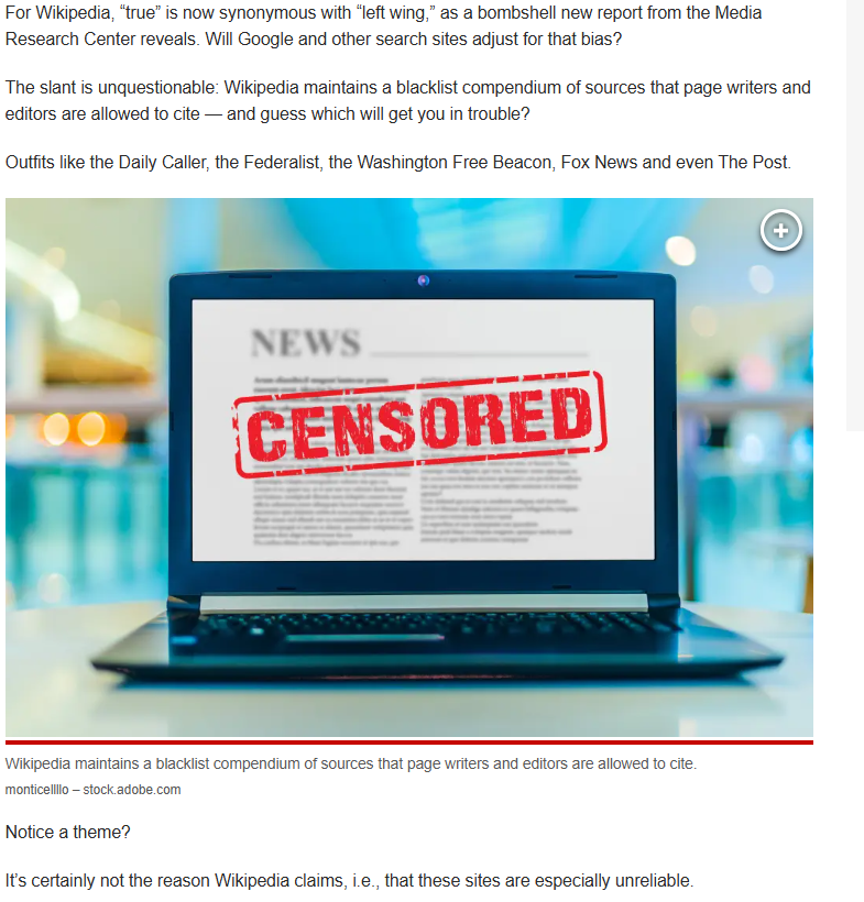 Да, у "Википедии" сформировался собственный стоп-лист. Названы даже издания, которые отправлены туда в рамках цензуры. Там оказались, к примеру, Daily Caller, Federalist, Washington Free Beacon, Fox News и даже The Post.