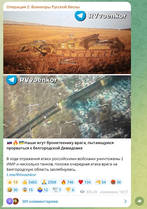- рапортует Telegram-канал "Операция Z: Военкоры Русской Весны".